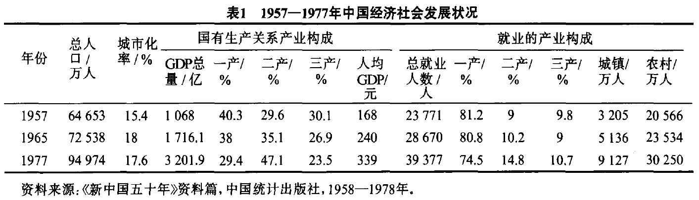 从表1中看到,这20年,国内生产总值增长近2倍,人均GDP增长2倍,经济结构已从一、三、二格局转变为二、一、三格局,而且工业增加值已占47.1%,农业增加值降到30%以下。但是在就业结构中,农业劳动力仍占74.5%,20年只下降6.7个百分点,特别是因为1959—1961年的3年自然灾害后,为了应对困难,实行城乡分治的户籍制度,严格限制农民进入城镇,城市化率倒退到17.6%。形成了中国特有的城乡二元经济社会结构,城市化严重滞后于工业化。在1977年的总人口中,农业户口占82.4%,农业劳动力占就业人数的74.5%,中国还是农业国家的社会结构。